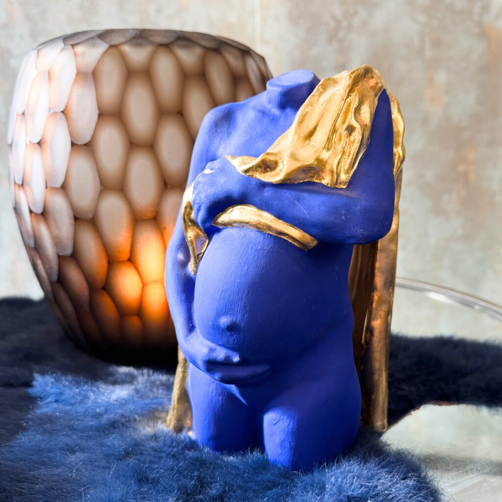 Blauw goud. Ultramarijn Blauw met Gouden Sjaal de combinatie van klassieke en moderne elementen. Het diepe ultramarijnblauw, dat eeuwenlang symbool stond voor luxe en spiritualiteit, vormt een prachtig contrast met de rijke glans van het goud. De gouden sjaal, sierlijk gedrapeerd over het lichaam, voegt een vleugje elegantie en verfijning toe, waardoor het kunstwerk een unieke en tijdloze uitstraling krijgt.